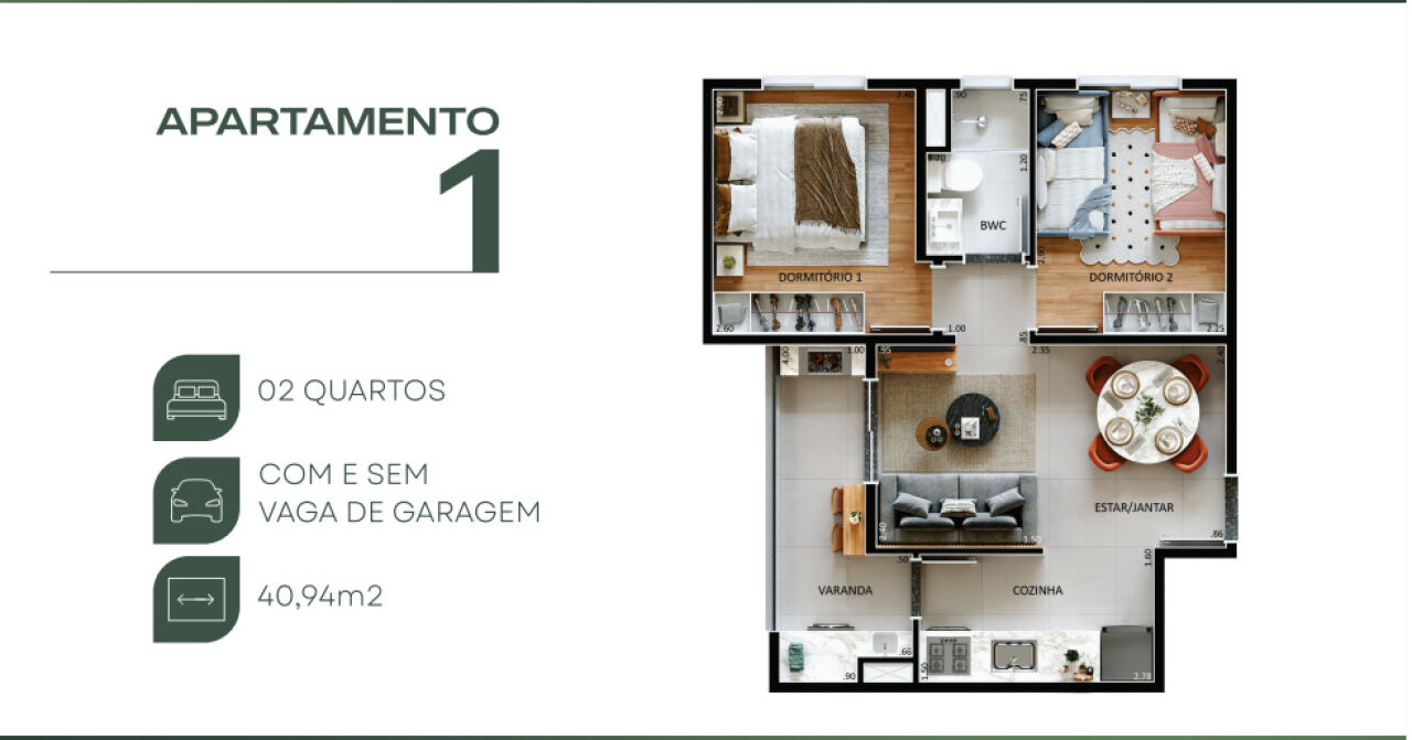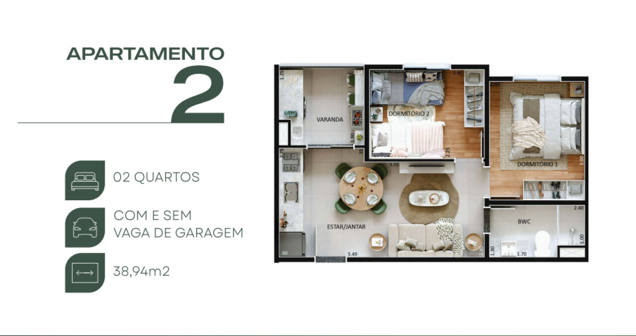 2 dormitórios sendo 1 suíte